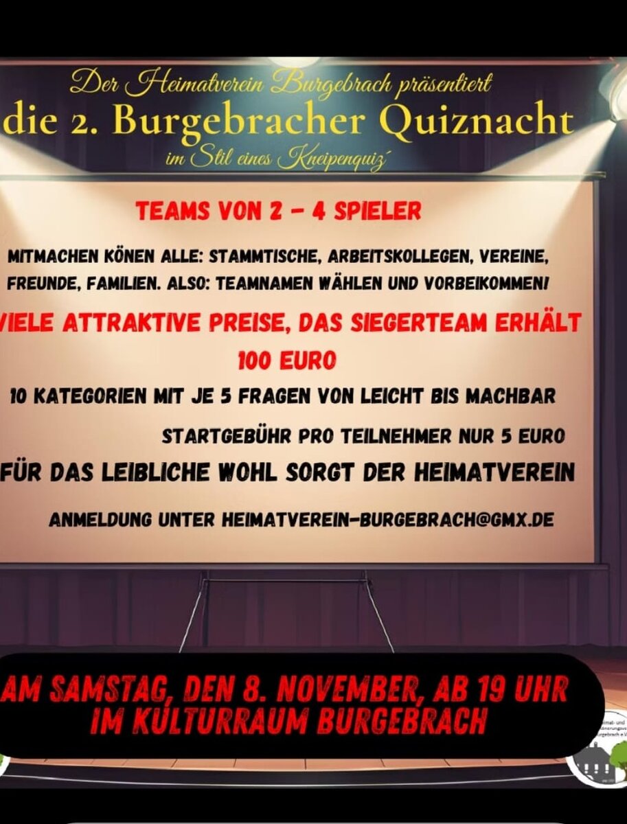 Am 08.11.2025 war es wieder soweit. Beim Burgebrach-Quiz haben wir wieder erfolgreich teilgenommen und einen schönen Preis errungen. Die Ergebnisse waren bei allen Gruppierungen sehr gut und deshalb lagen die Punkte und Platzierungen letztlich sehr eng beieinander. Allen Teilnehmern hat es sichtlich super gut gefallen! Danke dem Veranstalter!
